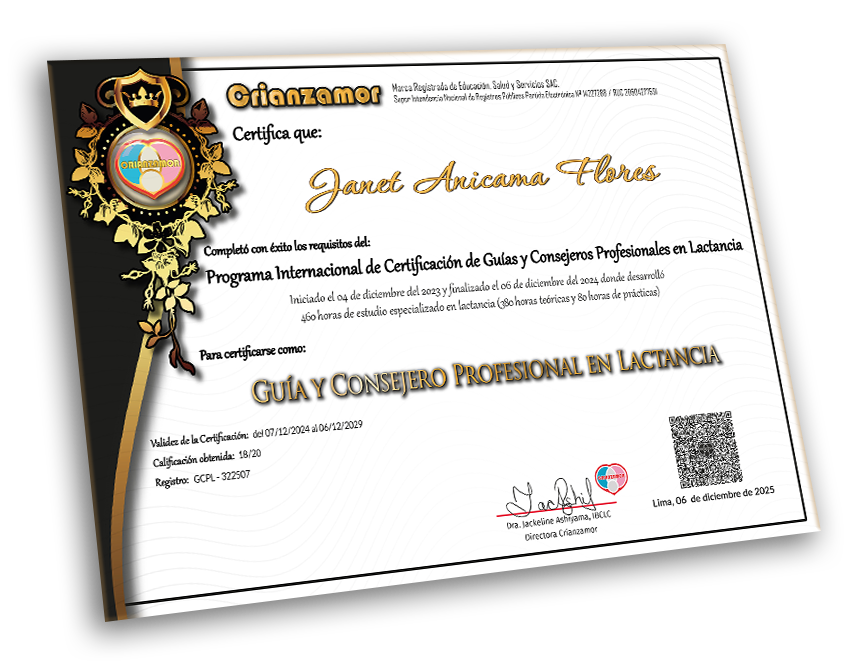 Con la Certificación Internacional como GCPL: Guía y Consejero Profesional en Lactancia, para ser reconocido como experto en ciencias del amamantamiento.